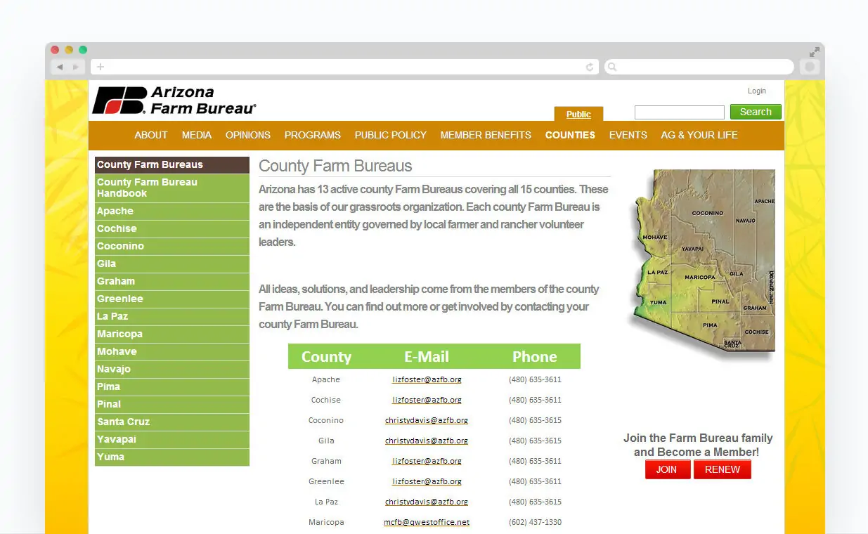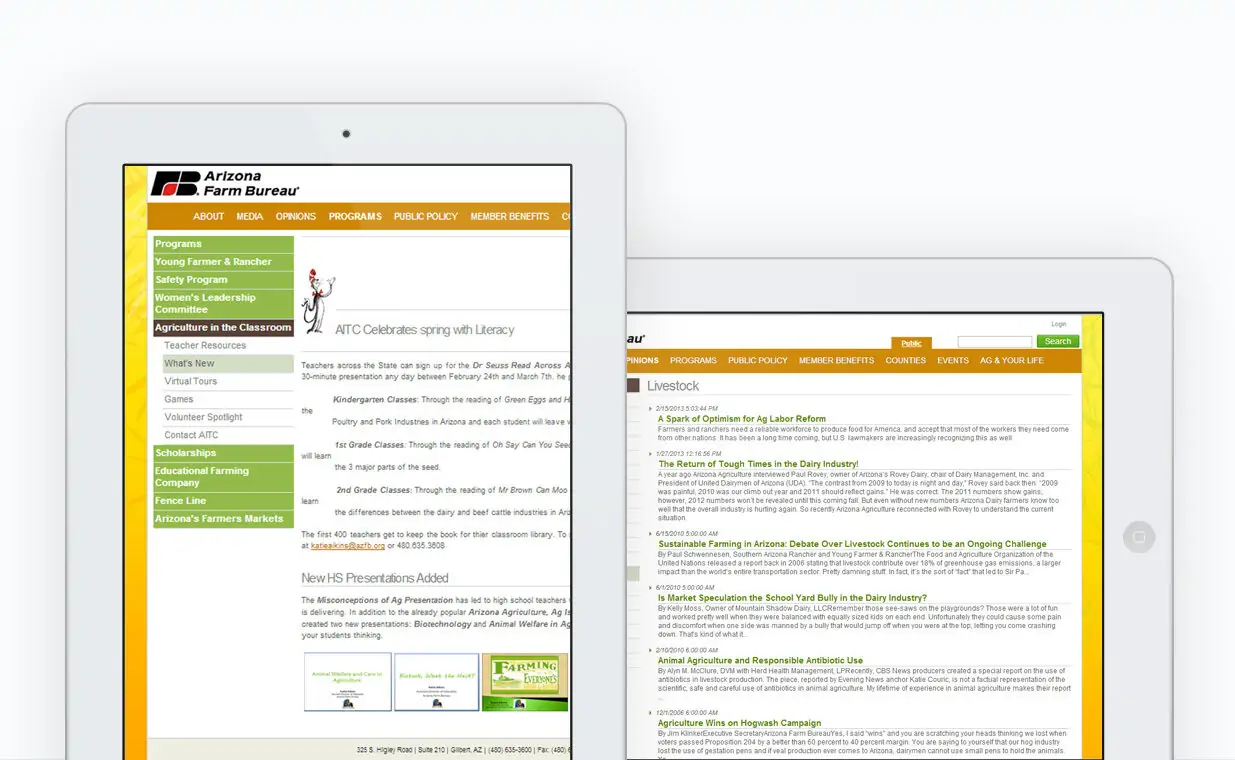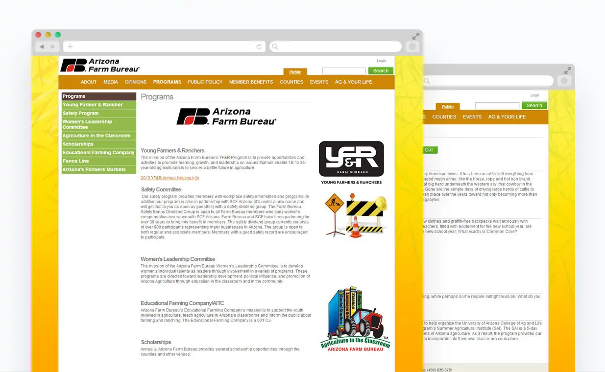 The Arizona Farm Bureau is an organization dedicated to improving the Arizona agriculture industry with increased involvement by members, educational pursuits, political emphasis, local programs and services. Our design team laid out a custom graphic design complete with multiple unique mock-ups for our client to review. Once a design was chosen, complex PHP programming and extensive MySQL database programming rounded out the project.