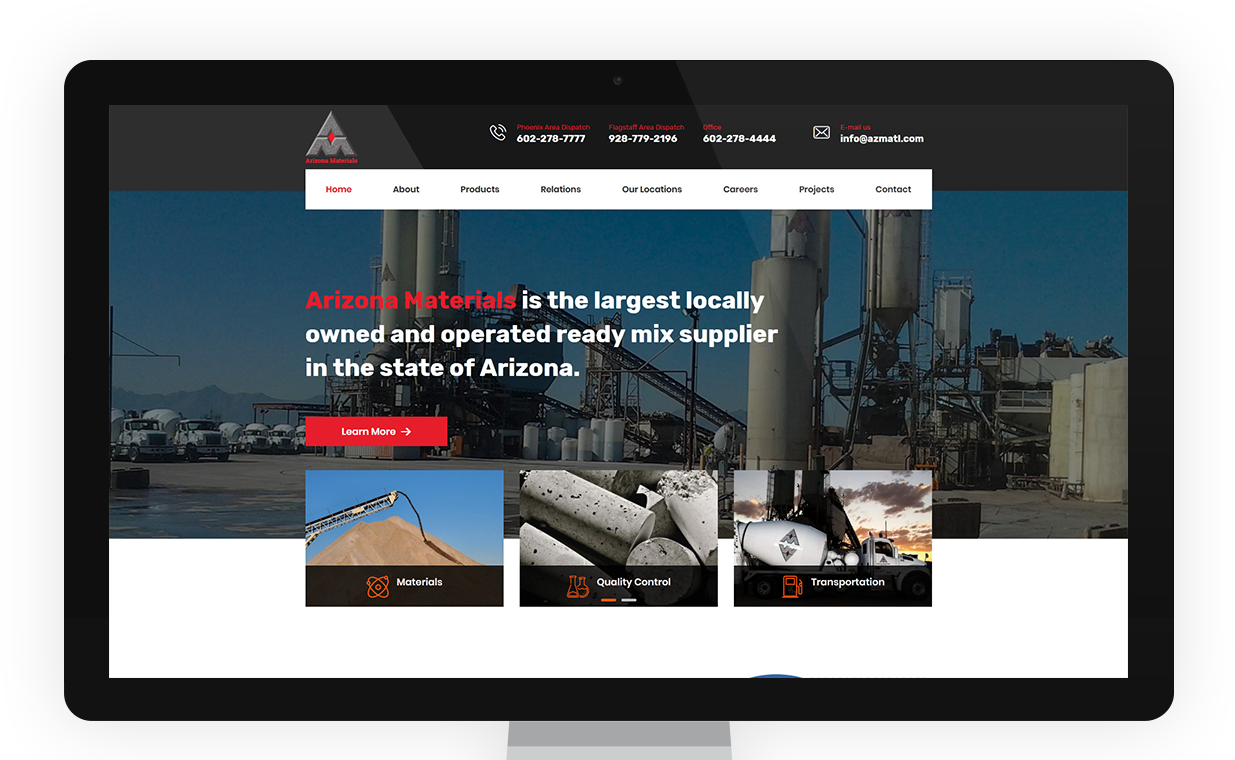 Locally owned and operated, Arizona Materials opened in 2003 has grown to be one the largest suppliers of a multitude of concrete types in the state. The custom WordPress web site offers quick access to company products, locations, past projects and a contact form. An expanded career section allows potential candidates to upload resumes and fill out comprehensive employment applications that are stored in a secure CMS.