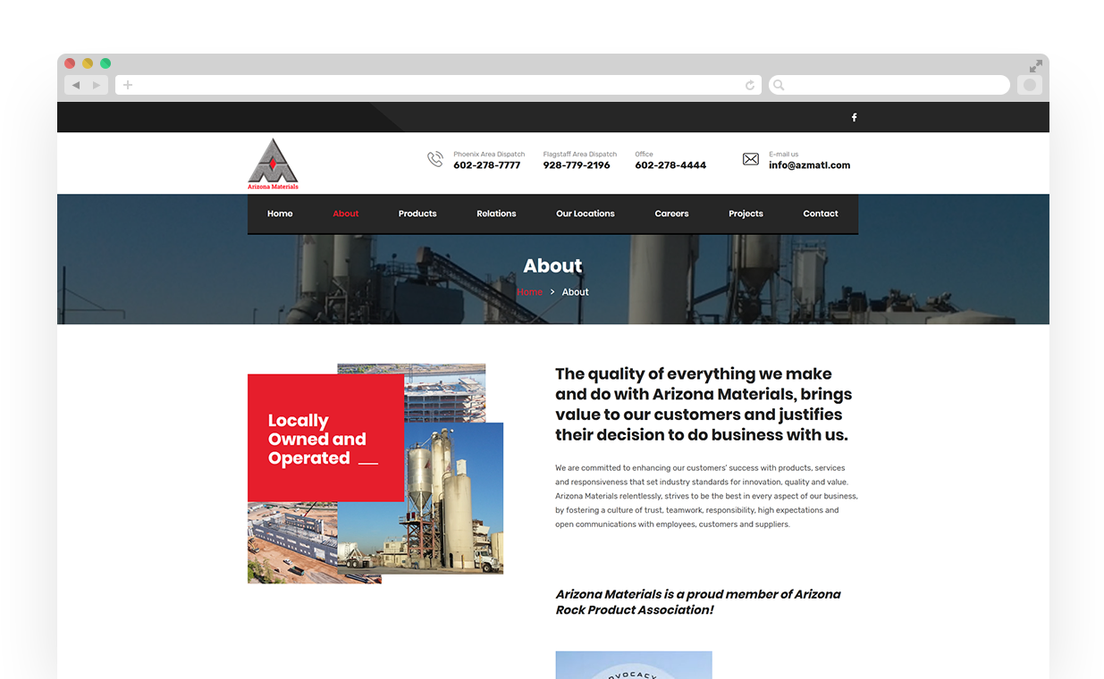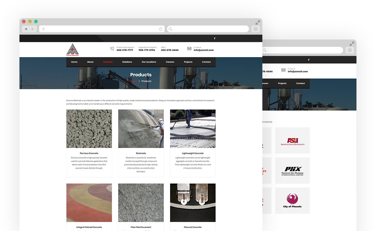 Locally owned and operated, Arizona Materials opened in 2003 has grown to be one the largest suppliers of a multitude of concrete types in the state. The custom WordPress web site offers quick access to company products, locations, past projects and a contact form. An expanded career section allows potential candidates to upload resumes and fill out comprehensive employment applications that are stored in a secure CMS.