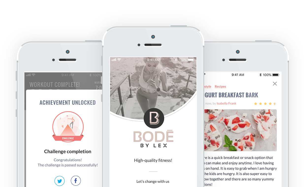 The Bode By Lex app is built to run on both the Android and Apple platforms. The app offers multi week exercise programs as well as daily fitness challenges. Achievements and leaderboard scoring allows users to track their progress. The app features Spotify integration so users can listen to their music playlists while exercising. A robust community section including private messaging, user forums and lifestyle blogs gives users the chance to connect with one another. The apps content and users are managed from a robust back-end that runs of a cloud based server. Payment for the app is done via 7 day free trial, monthly and yearly in-app purchase.