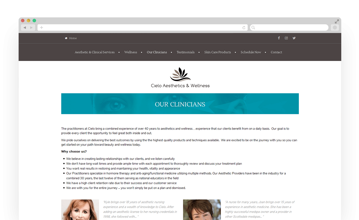 Located in Mesa, Arizona, Cielo Aesthetics offers world class spa services to their clients. This new website development project included custom web design and a WordPress based Content Management System so Cielo can add/edit all content. Net-Craft also provides WordPress hosting and WordPress security and plug-in updates.