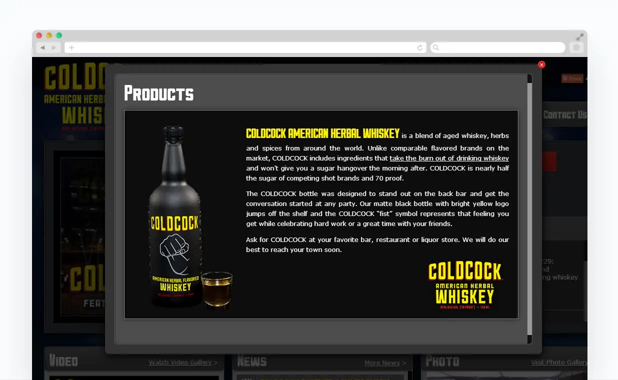 Net-Craft created a custom designed website, comprehensive content management system and mobile website for a new alcohol brand, COLDCOCK American Herbal Whiskey. The website features a video player, social media integration, online submission forms, sound player and expanded slideshow capability. COLDCOCK also had Net-Craft custom design their Facebook and Twitter pages.