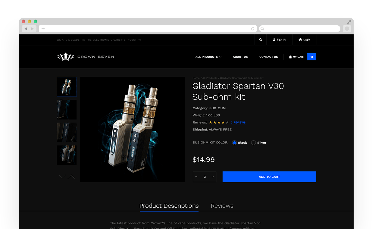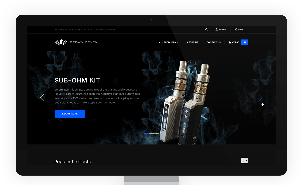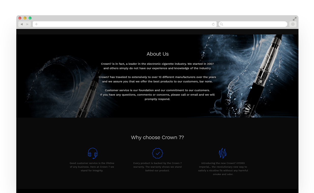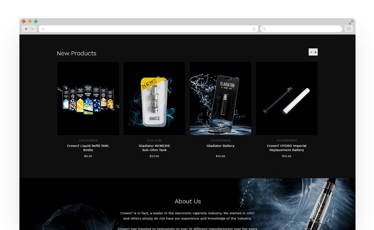 Crown7 is an industry leader in the eCig and vape industry. The Crown7.com website is built on the bigCommerce development platform and allows the administrator easy access to update site content, products and incoming online orders.