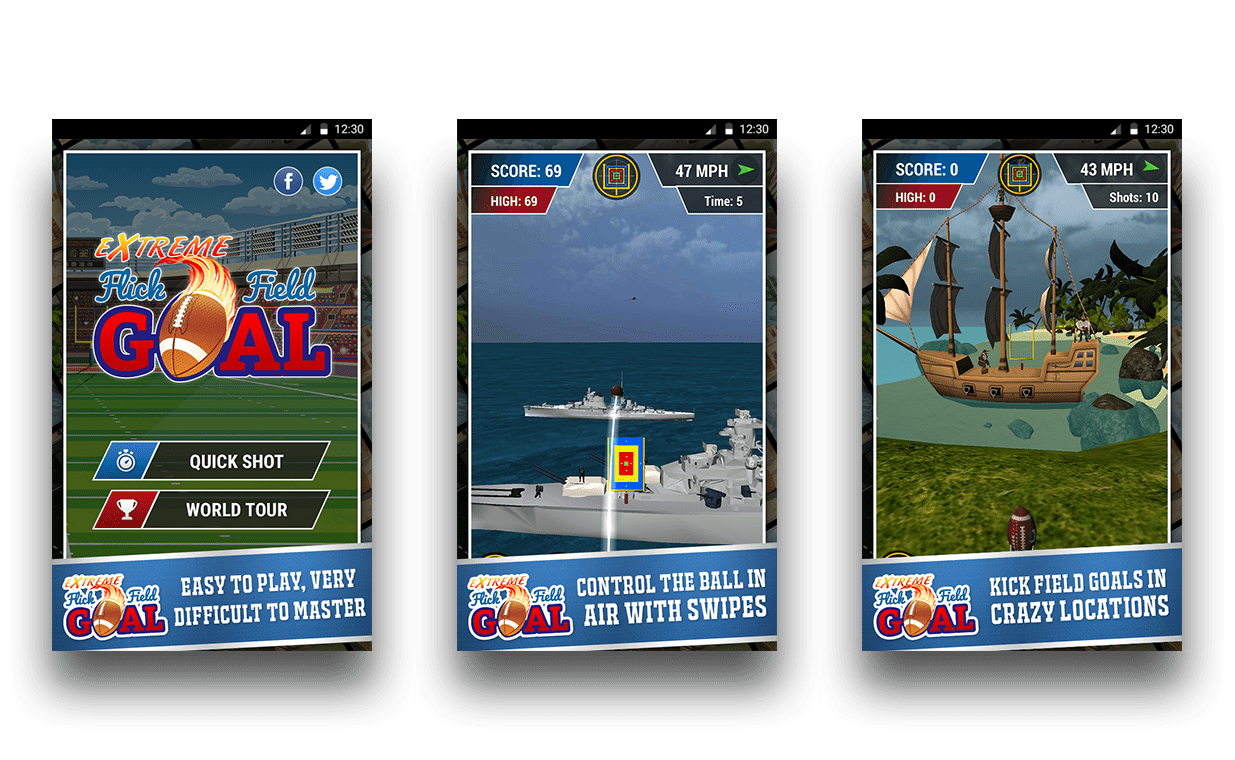 Extreme Flick Field Goal is an Android and iPhone sports game that challenges players to flick their finger to kick a football through a goal post. Instead of a football field kicking is done in exotic locations such as the Moon, Moscow, a battleship, the desert etc.. The game includes in-app purchases, game trophies, statistics, social sharing, and performance achievements. The game is developed using the mobile 3D Unity engine.