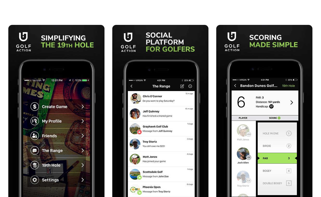 Golf Action is a natively built IOS and Android app that makes it easy to track scoring, bets and side games on the golf course. The app supports up to five player games, positive and negative handicaps and multiple golf betting games including Nassau, 9 Point, Skins and more. The app also includes social features such as a public forum, private groups and messaging. The app will be monetized with IAP for additional games.