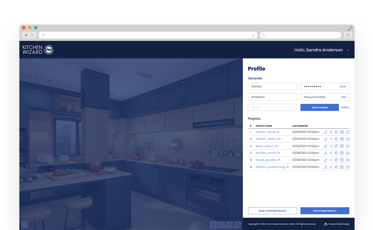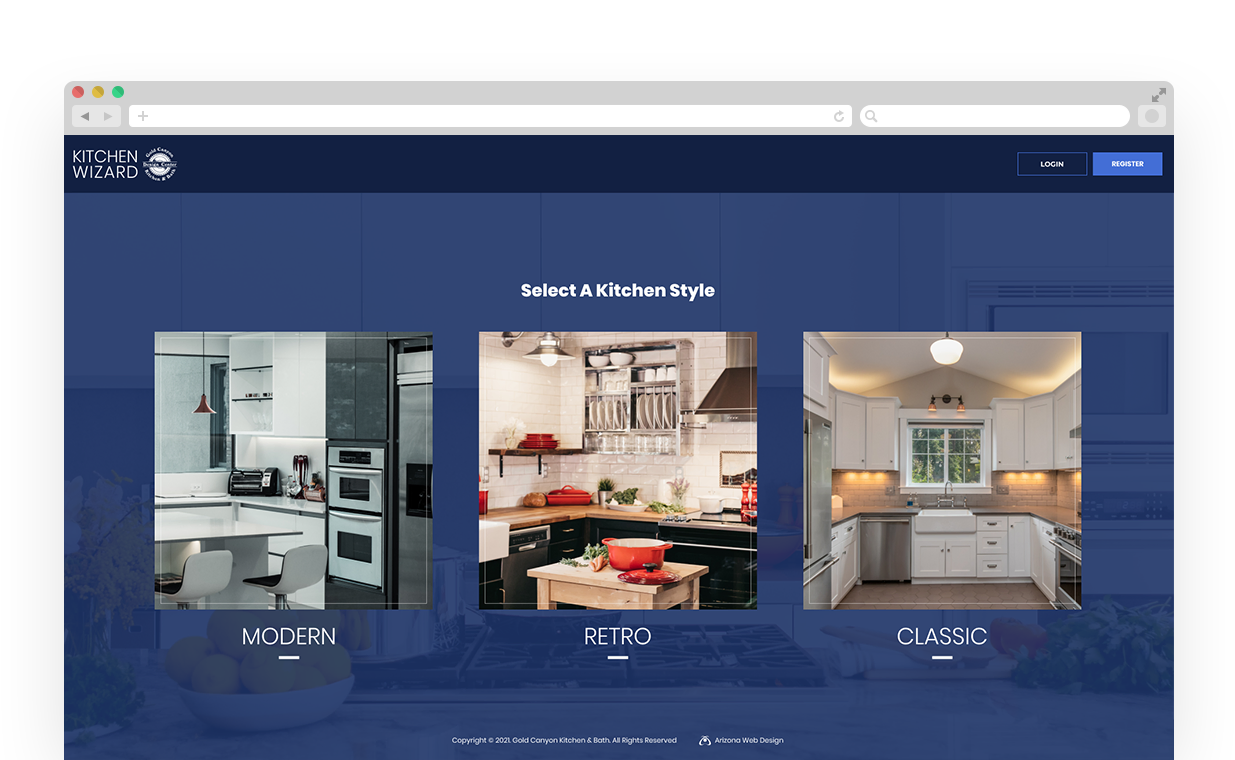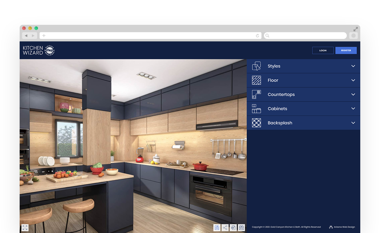 Our client Gold Canyon Kitchen & Bath wanted a way to show prospective clients what their kitchen remodel would look like post construction. Net-Craft designed a web based 3D software visualization tool that meets this requirement. In version one, users can select the initial kitchen style, cabinets, backsplash, countertops and floor. By clicking on swatch samples the three-dimensional kitchen environment is updated in real-time with the chosen style and can be panned and zoomed. Projects can be saved for later editing as well as shared via PDF or email. Users have the opportunity to create an account so that multiple projects can be saved. Future versions will add bathrooms and more kitchen styles.