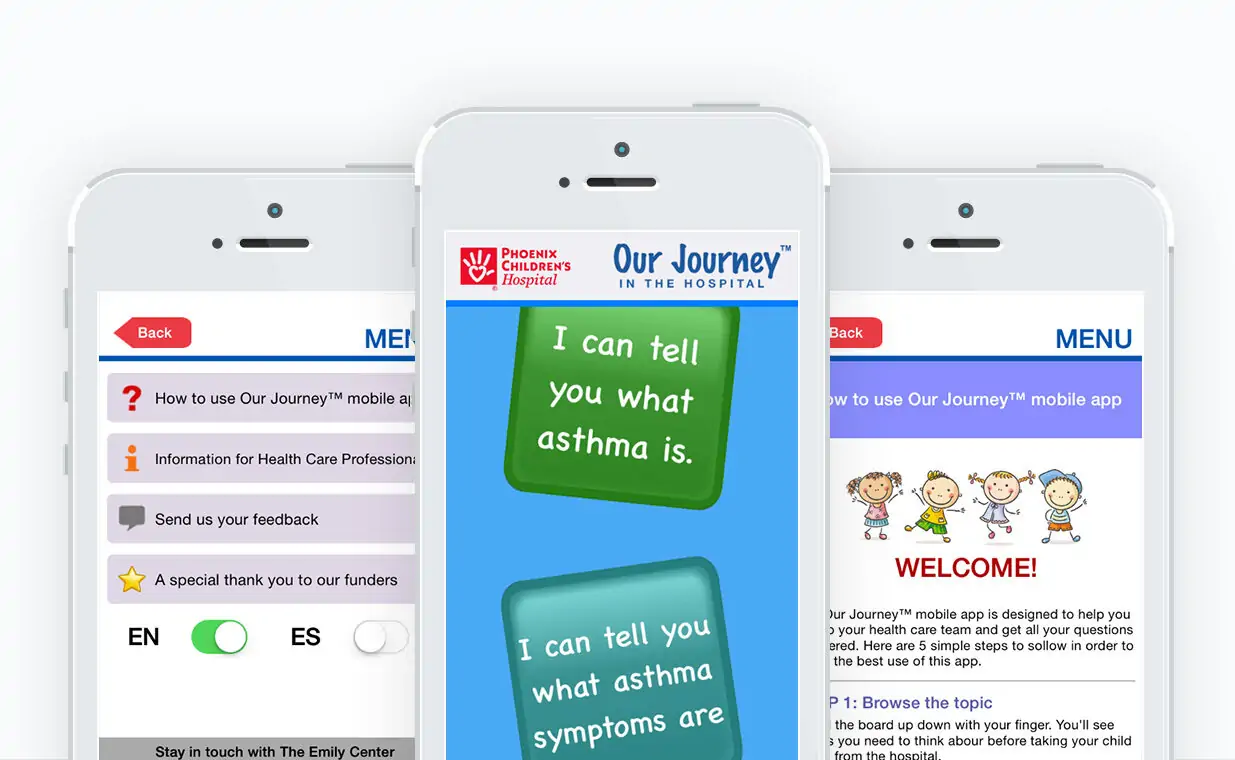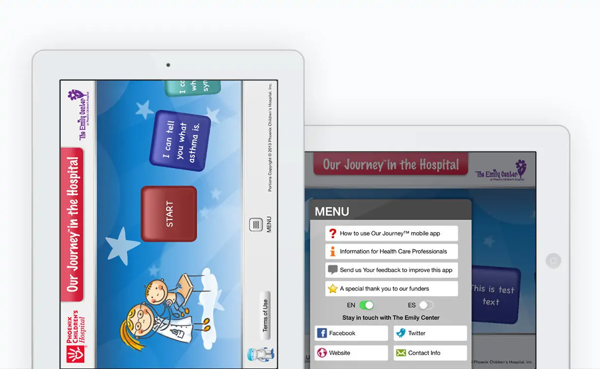 When a child is in the hospital it can be an incredible stressful time for the patient and their families. The Journey Board apps is an Android and iPhone app for smartphones and tablets. It is also available in Spanish and contains information about a variety of treatment courses. The solution developed also includes a robust CMS (content management system) that allows Phoenix Children staff to add and edit content within the app.