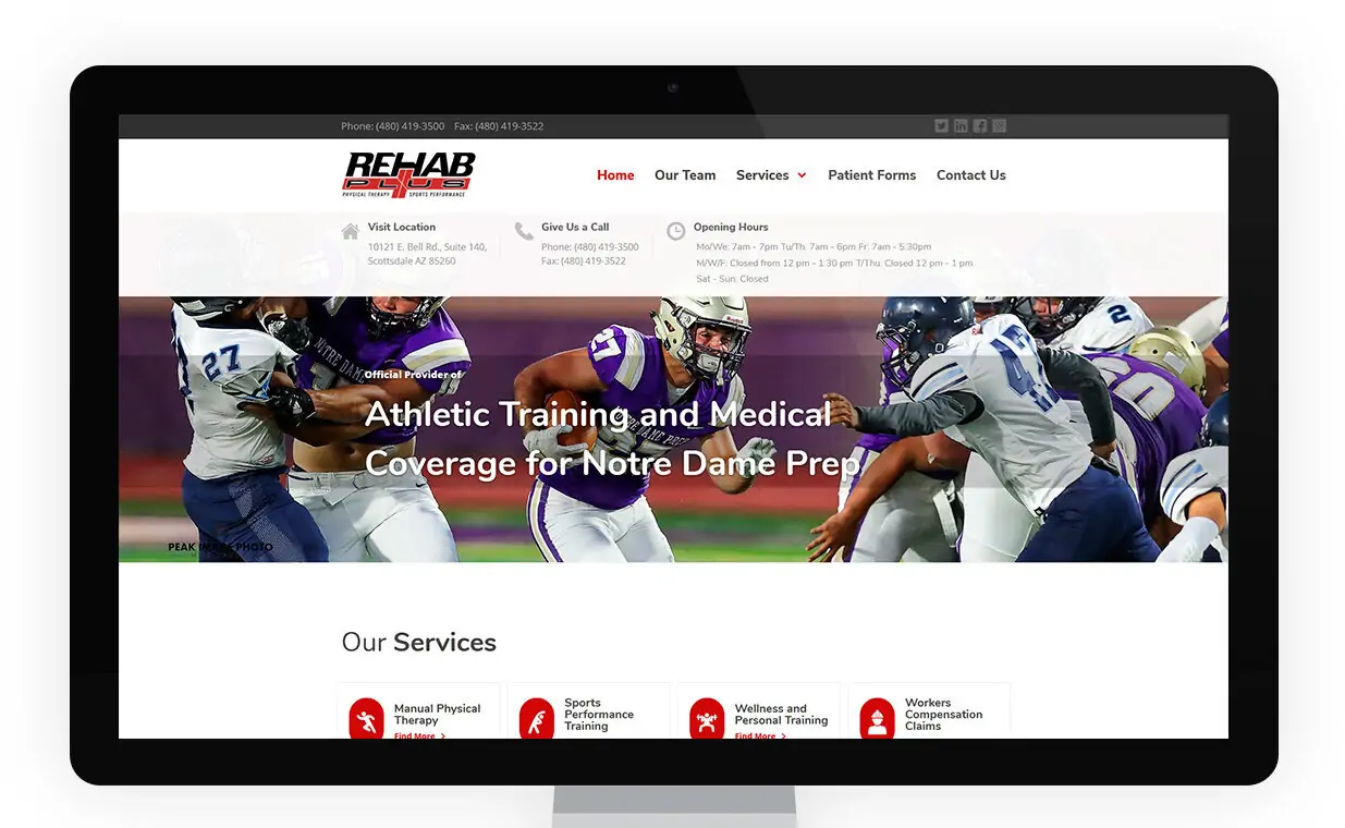 The Scottsdale location of Rehab Plus Physical Therapy offers orthopedic rehab, wellness and sports performance training. The customized WordPress website offers an easy to use portal where potential customers can access detailed service offerings, patient forms and contact information.