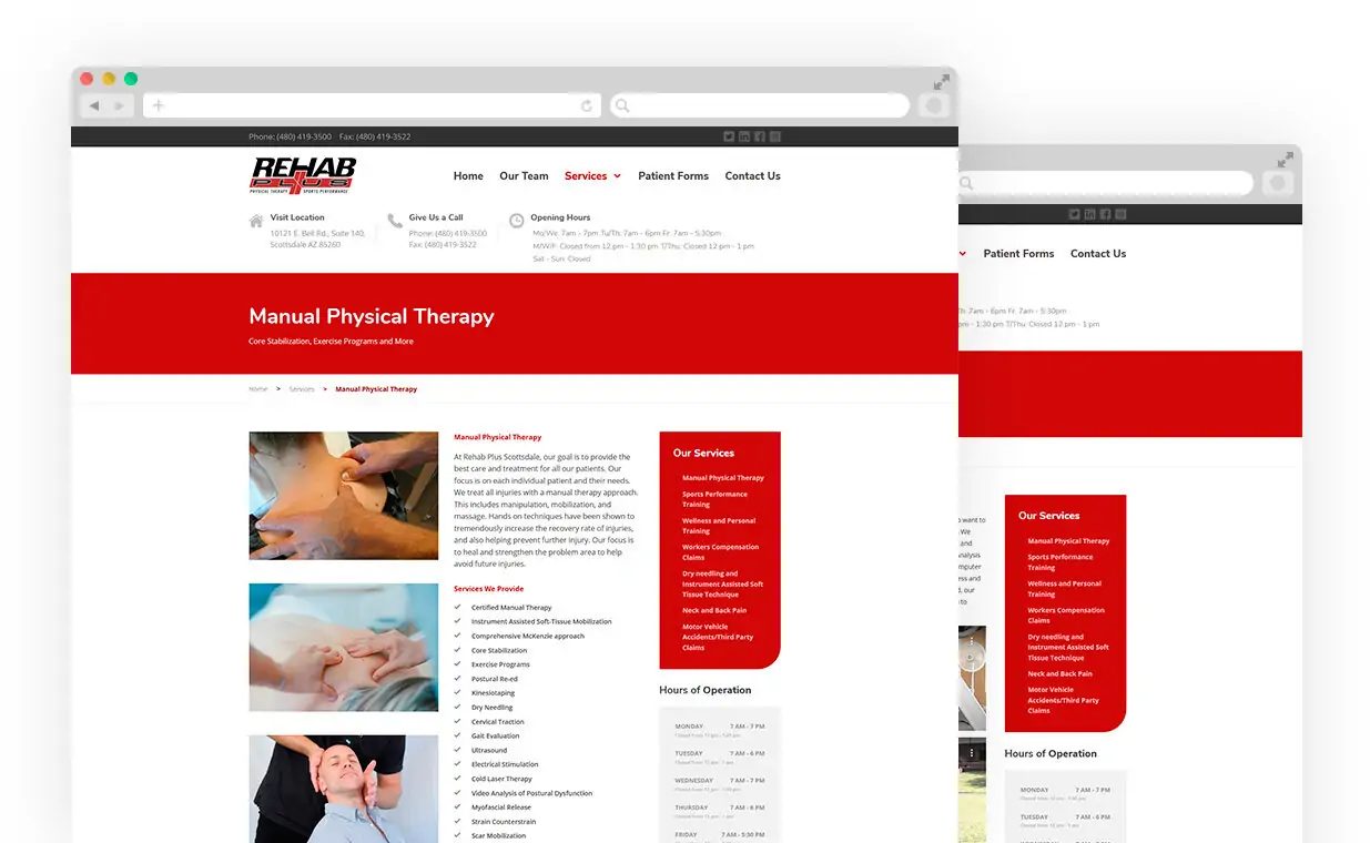 The Scottsdale location of Rehab Plus Physical Therapy offers orthopedic rehab, wellness and sports performance training. The customized WordPress website offers an easy to use portal where potential customers can access detailed service offerings, patient forms and contact information.