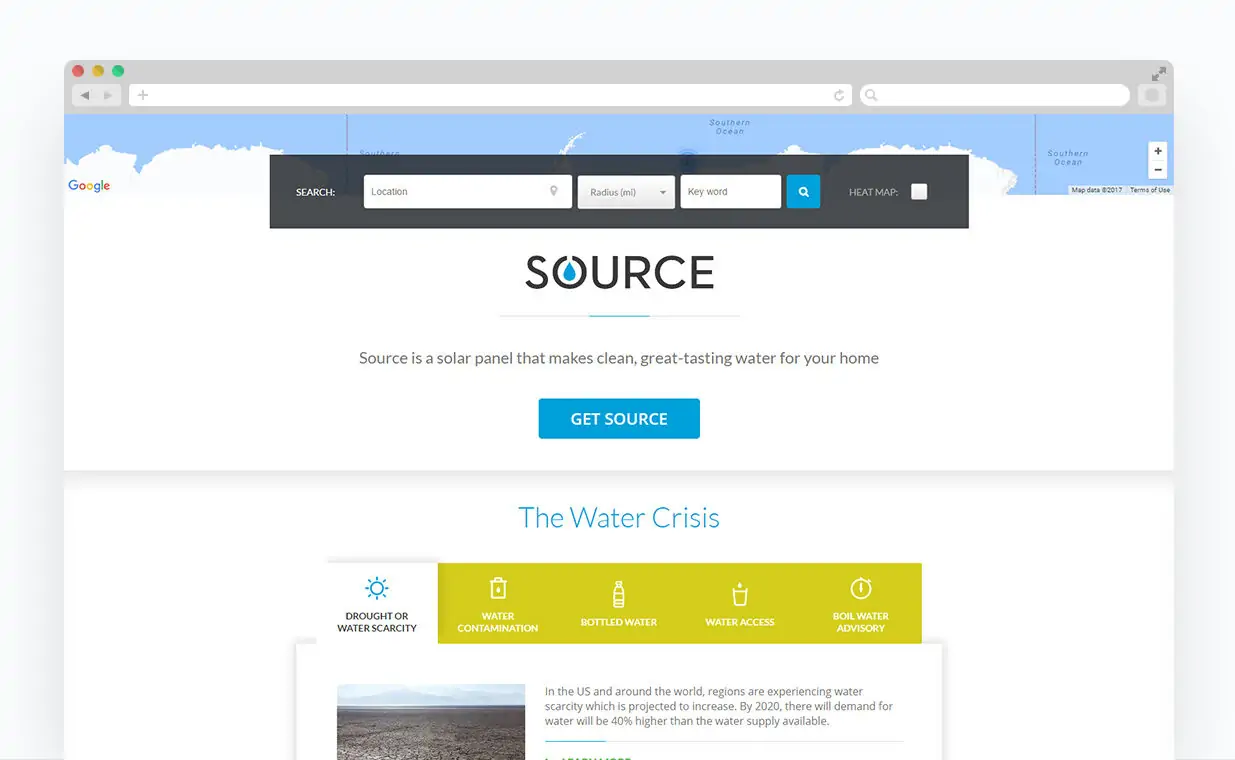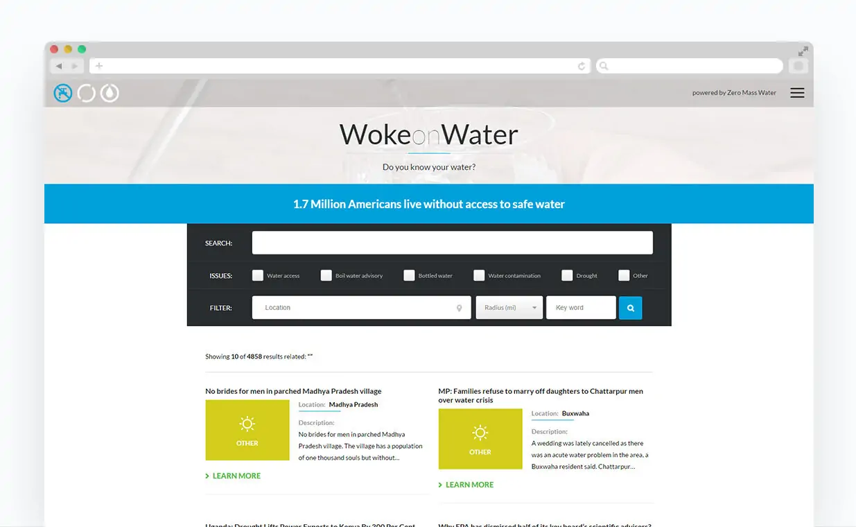 Water scarcity is a huge and ever increasing problem facing the United States and the world. The WokeonWater.org website was created to document water issues such as scarcity, contamination and access. Net-Craft created a website that allows users to search for water problems based on location and water issue.